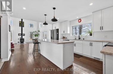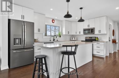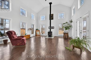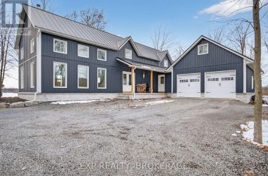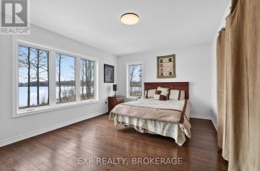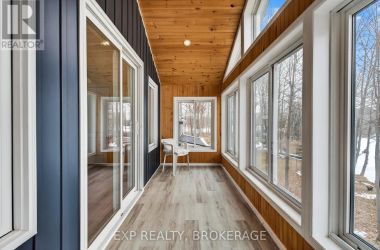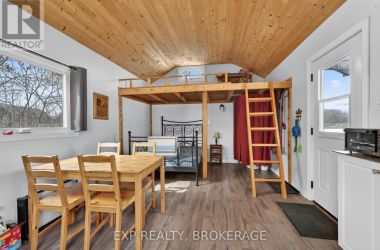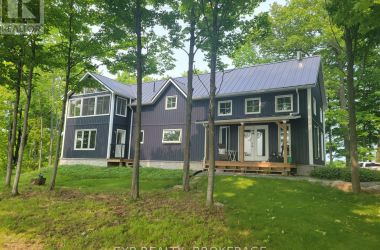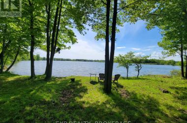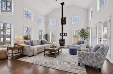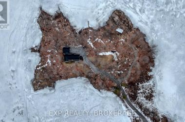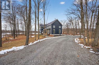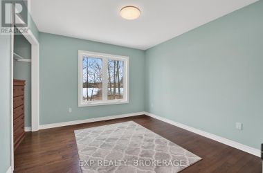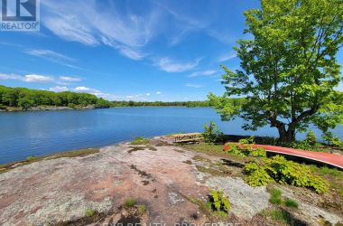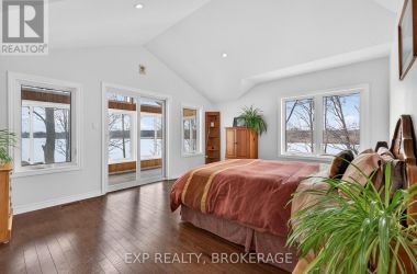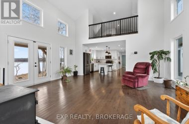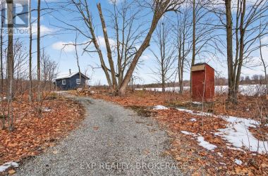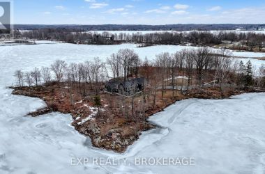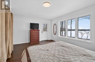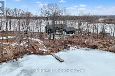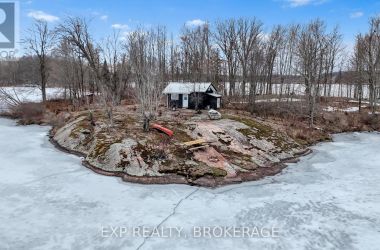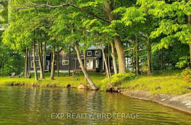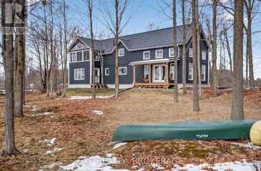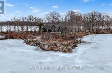 Welcome to 3855 Hideaway Lane, a rare waterfront sanctuary where privacy, luxury, and nature converge. Set on a breathtaking 5.8-acre peninsula with 2,798.4 feet of shoreline along the historic Rideau Canal at Dog Lake, this one-of-a-kind property offers uninterrupted 360-degree water views and complete seclusion just 25 minutes from Kingston. Arrive via a private laneway surrounded by water on both sides, leading to a stunning custom-built, 2-storey home finished in Marine Dusk vinyl siding. Built just 4 years ago, this meticulously designed residence features 2,100 sq/ft of living space and showcases soaring 17-foot ceilings in the spectacular great room, where floor-to-ceiling windows frame panoramic lake views and create an unforgettable living experience. The open-concept main floor is anchored by a gourmet kitchen with a granite island, seamlessly flowing into the expansive living and dining areas. Acentrally located WETT-certified woodstove adds warmth and ambiance, complemented by an energy-efficient heat pump/AC system. Premium finishes include Gunsmoke oak hardwood flooring,triple-glazed windows, and an ICF foundation with a dry, heated crawl space for additional storage. The home offers 3 bedrooms, including two on the main level and a private upper-level primary retreat featuring a walk-in closet, ensuite bath, and an enclosed sunroom overlooking the water. One main-floor bedroom, with its own entrance near the shoreline, presents excellent potential for an in-law suite or boutique B&B accommodation. Upstairs, a spacious media loft overlooks the Great Room below, enhancing the home's open, airy design. Additional highlights include an attached double-car garage with unfinished loft space, a 30-foot dock (year-round), and a forested landscape. A fully renovated waterfront bunkie set on a granite outcrop overlooking Milburn Bay. Complete with electricity, a woodstove, running water, and acomposting toilet, it is currently a successful Airbnb. (id:50836)