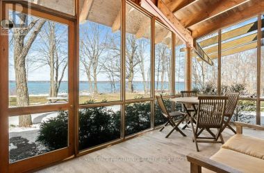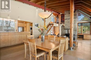 Very private waterfront home, on 24 acres with 505 feet of shoreline on the St. Lawrence River on the north shore of Wolfe Island. This architectural gem is a masterpiece, designed and built by some of the area's finest craftsmen. Its unique design draws inspiration from an upside-down boat, making it truly one-of-a-kind. The red cedar siding and soft-toned sloping steel roof blend seamlessly with the surrounding nature. You'll be amazed by the wall of floor-to-ceiling windows that offer breathtaking views of the bay, river, and countless waterfowl. The home's features include stunning vaulted ceiling with exposed Douglas fir Columns , spruce upper deck, and the open concept kitchen, and dining room that leads out to a cozy screened-in porch, living room with woodstove, and stunning interior limestone chimney. Enjoy the comfort of slab-on-grade heating on the cork and poured concrete flooring. The principal bedroom, with a four-piece ensuite, walk-in closet, and patio door, leads to a sitting area overlooking the water. The open stairwell leads to an office with incredible views and side deck. This space could be easily converted into an additional bedroom. On the other side of the great room, you'll find a guest room with patio doors leading to an outside sitting area and a second full bathroom. The home's layout and design offer ample storage where needed. Outside is a three-bay garage with a workshop, perfect for home improvement projects and storing your toys. The clean waterfront is perfect for swimming, or to jump into your boat and head to Kingston for dinner or down the river to explore the 1000 Islands. Hike your own private trails, and appreciate the decades of love and dedication poured into this wildlife oasis. Watch the breathtaking sunsets over McDonell Bay and the mainland, light a bonfire, and gaze at the stars in the dark night sky. Escape the hustle and bustle of city life, and discover the wonders of this wonderful community. (id:50836)