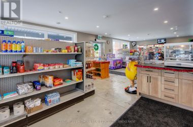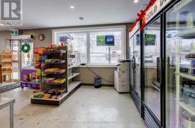 Convenience store and food service location in the Village of Lyn, Ontario, located between Brockville and Mallorytown. The premises are currently operated as a convenience retail business offering freshly made pizza and hot food, subs, burgers, poutine, baked goods, coffee, ice cream, seasonal frozen treats, groceries and snacks, lottery services, propane exchange, firewood, ice, and related retail items. The business holds AGCO approvals for beer, wine, and ready-to-drink beverages, as well as OLG authorization, with licence transfers subject to CPIC approval. A newer operation that is performing well, with strong upside and opportunity for expansion under new ownership. The main floor layout is efficient and purpose-built, featuring a large retail area, kitchen and food preparation spaces, cooler, storage rooms, washroom, and service areas. Fixtures and equipment are included; inventory to be purchased separately. (id:50836)